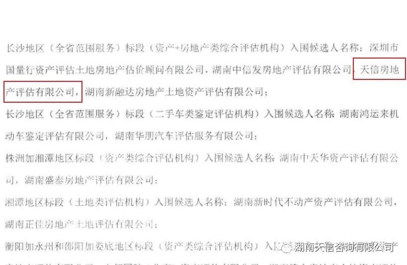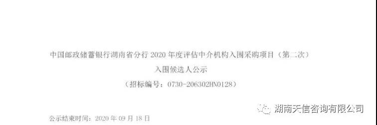 2020年9月15日,天信房地產(chǎn)評估有限公司成功中標“中國郵政儲蓄銀行湖南省分行全省范圍2020年度評估機構(gòu)資產(chǎn)評估和房地產(chǎn)評估業(yè)務采購項目”。