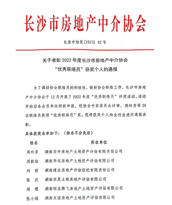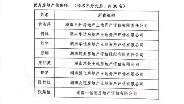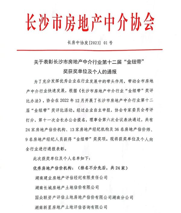 為表彰優(yōu)秀估價(jià)機(jī)構(gòu)、從業(yè)人員,鼓勵(lì)機(jī)構(gòu)和從業(yè)人員提升專業(yè)水平、提高服務(wù)質(zhì)量,促進(jìn)行業(yè)健康發(fā)展,長沙市房地產(chǎn)中介協(xié)會每年都將表彰一批優(yōu)秀估價(jià)機(jī)構(gòu)和個(gè)人,樹立典型、引導(dǎo)行業(yè)。