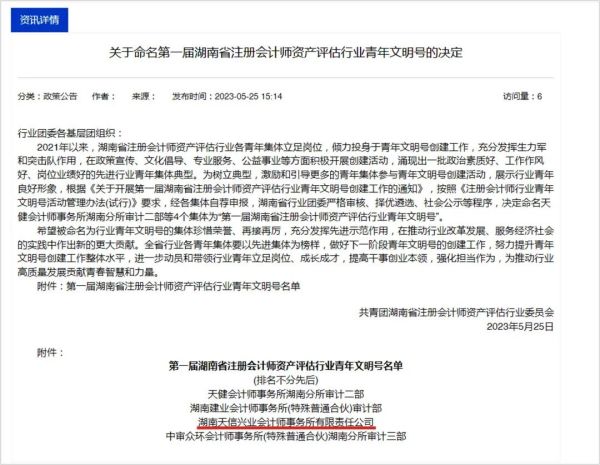 2023年5月25日,共青團(tuán)湖南省注冊(cè)會(huì)計(jì)師資產(chǎn)評(píng)估行業(yè)委員會(huì)發(fā)布公告,命名湖南天信興業(yè)會(huì)計(jì)師事務(wù)所有限責(zé)任公司等4個(gè)集體為“第一屆湖南省注冊(cè)會(huì)計(jì)師資產(chǎn)評(píng)估行業(yè)青年文明號(hào)”,湖南天信興業(yè)會(huì)計(jì)師事務(wù)所作為一個(gè)整家事務(wù)所被命名為行業(yè)青年文明號(hào)的集體,為湖南天信咨詢集團(tuán)爭(zhēng)得了無上榮譽(yù),可喜可賀!