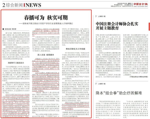《中國(guó)會(huì)計(jì)報(bào)》刊登題為《春播可為秋實(shí)可期——湖南省開(kāi)展注冊(cè)會(huì)計(jì)師資產(chǎn)評(píng)估行業(yè)首期高端人才培養(yǎng)側(cè)記》的專題報(bào)道,并摘錄了對(duì)天信評(píng)估公司申巍同志的采訪