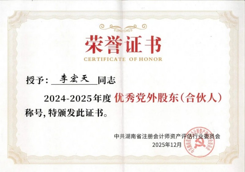 ?集團(tuán)董事長李宏天榮膺“湖南省注冊會計(jì)師資產(chǎn)評估行業(yè)2024-2025年度優(yōu)秀黨外股東(合伙人)”;