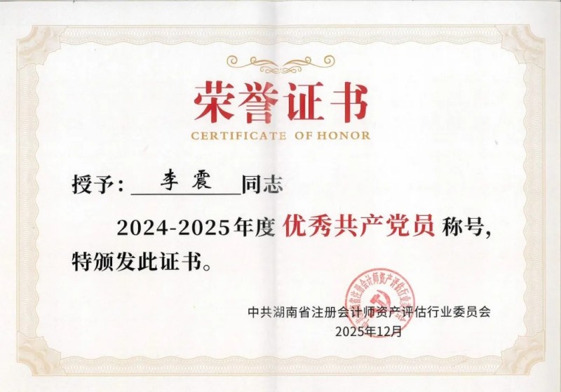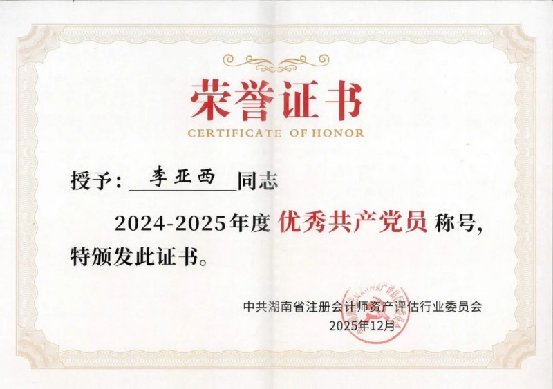 ?黨支部書記、湖南天信興業(yè)會計(jì)師事務(wù)所有限責(zé)任公司副總經(jīng)理李亞西,黨員、集團(tuán)總裁李震雙雙獲評“湖南省注冊會計(jì)師資產(chǎn)評估行業(yè)2024-2025年度優(yōu)秀共產(chǎn)黨員”。