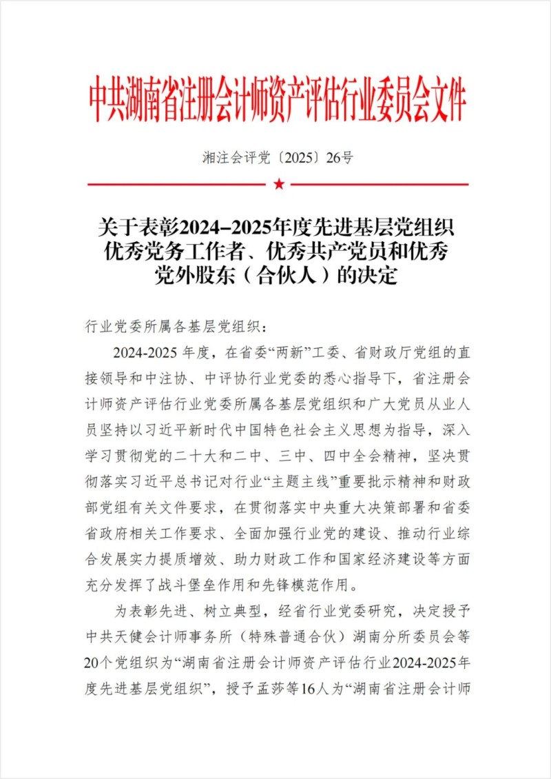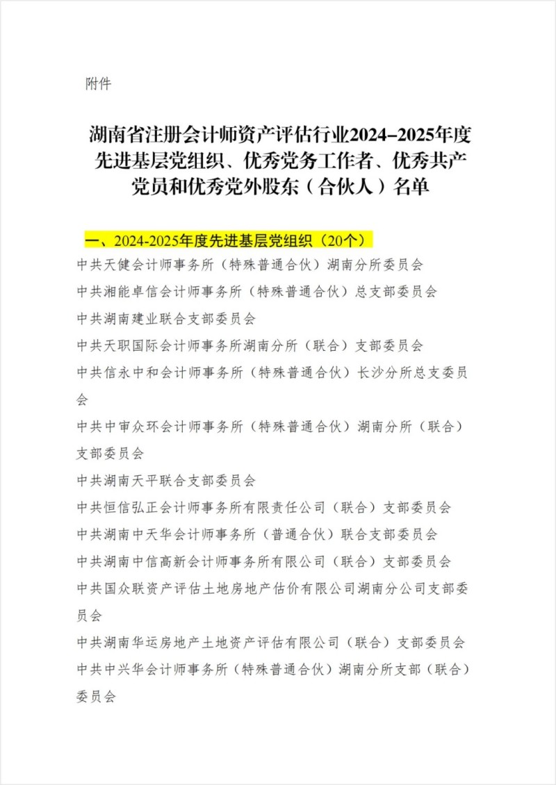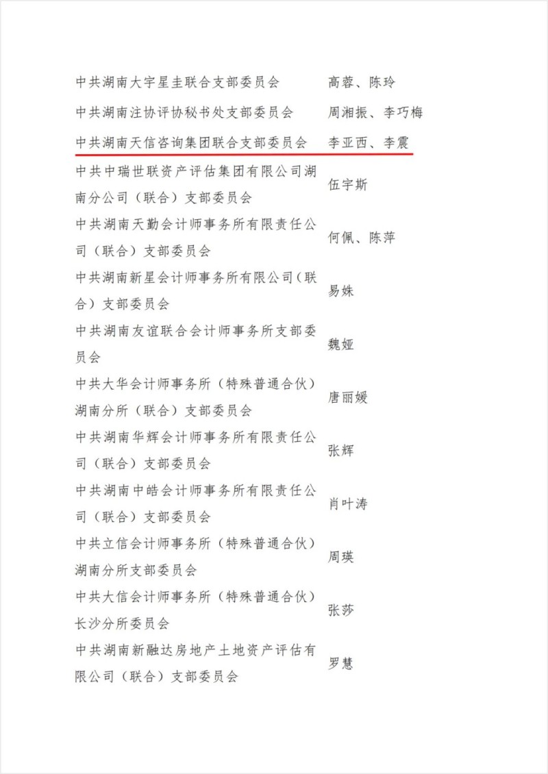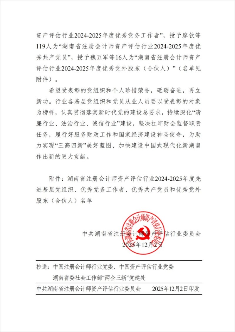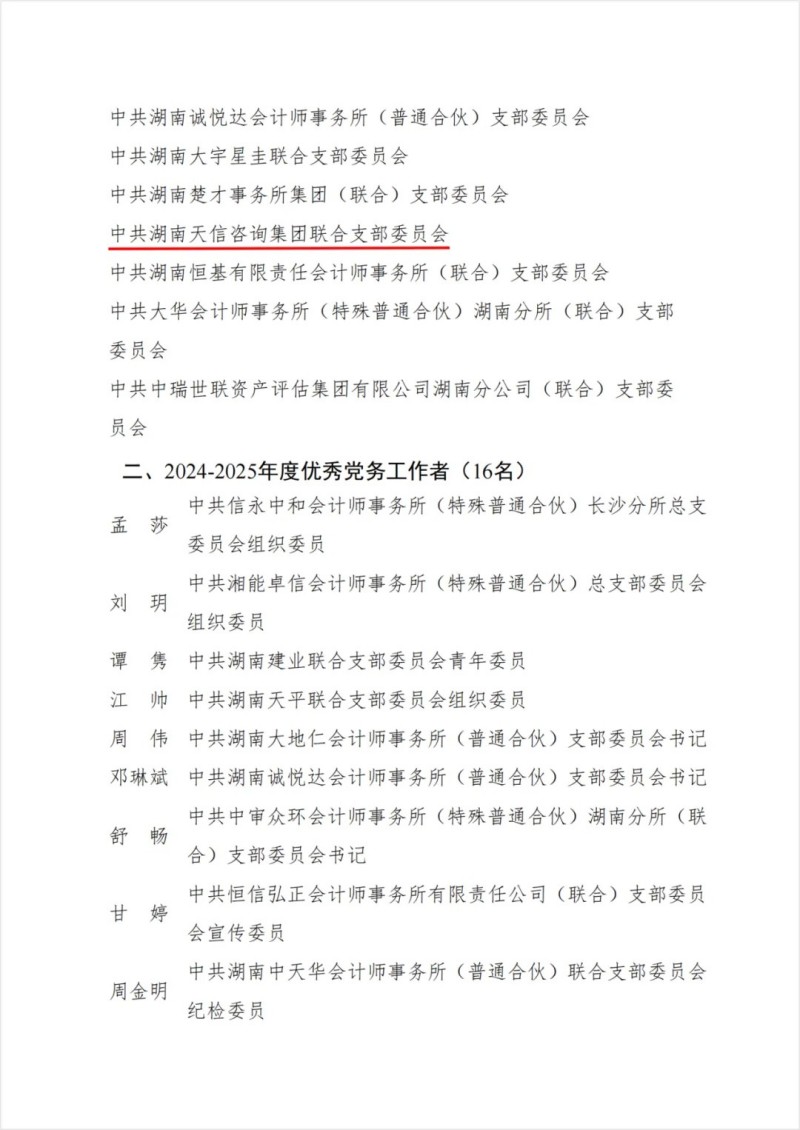 ?中共湖南天信咨詢集團(tuán)聯(lián)合支部委員會被授予“湖南省注冊會計(jì)師資產(chǎn)評估行業(yè)2024-2025年度先進(jìn)基層黨組織”;