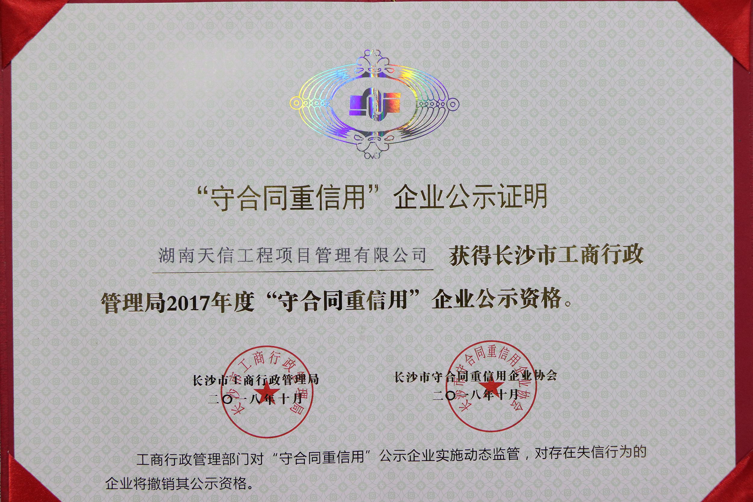 【天信新聞】熱烈慶祝天信工程項目管理有限公司與天信房地產(chǎn)評估有限公司光榮上榜2017年度長沙守合同重信用企業(yè)資格