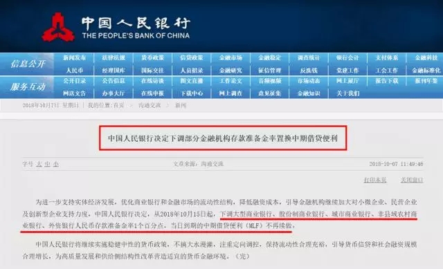 10月7日,央行發(fā)布公告稱,從2018年10月15日起,下調(diào)大型商業(yè)銀行、股份制商業(yè)銀行、城市商業(yè)銀行、非縣域農(nóng)村商業(yè)銀行、外資銀行人民幣存款準(zhǔn)備金率1個(gè)百分點(diǎn)(存款準(zhǔn)備金率:指金融機(jī)構(gòu)為保證客戶提取存款和資金清算需要而準(zhǔn)備的在中央銀行的存款占其存款總額的比例,這部分資金是不能夠用于發(fā)放貸款的。降準(zhǔn)即下調(diào)這個(gè)比例,意味著釋放在市場(chǎng)上的資金將增加)。